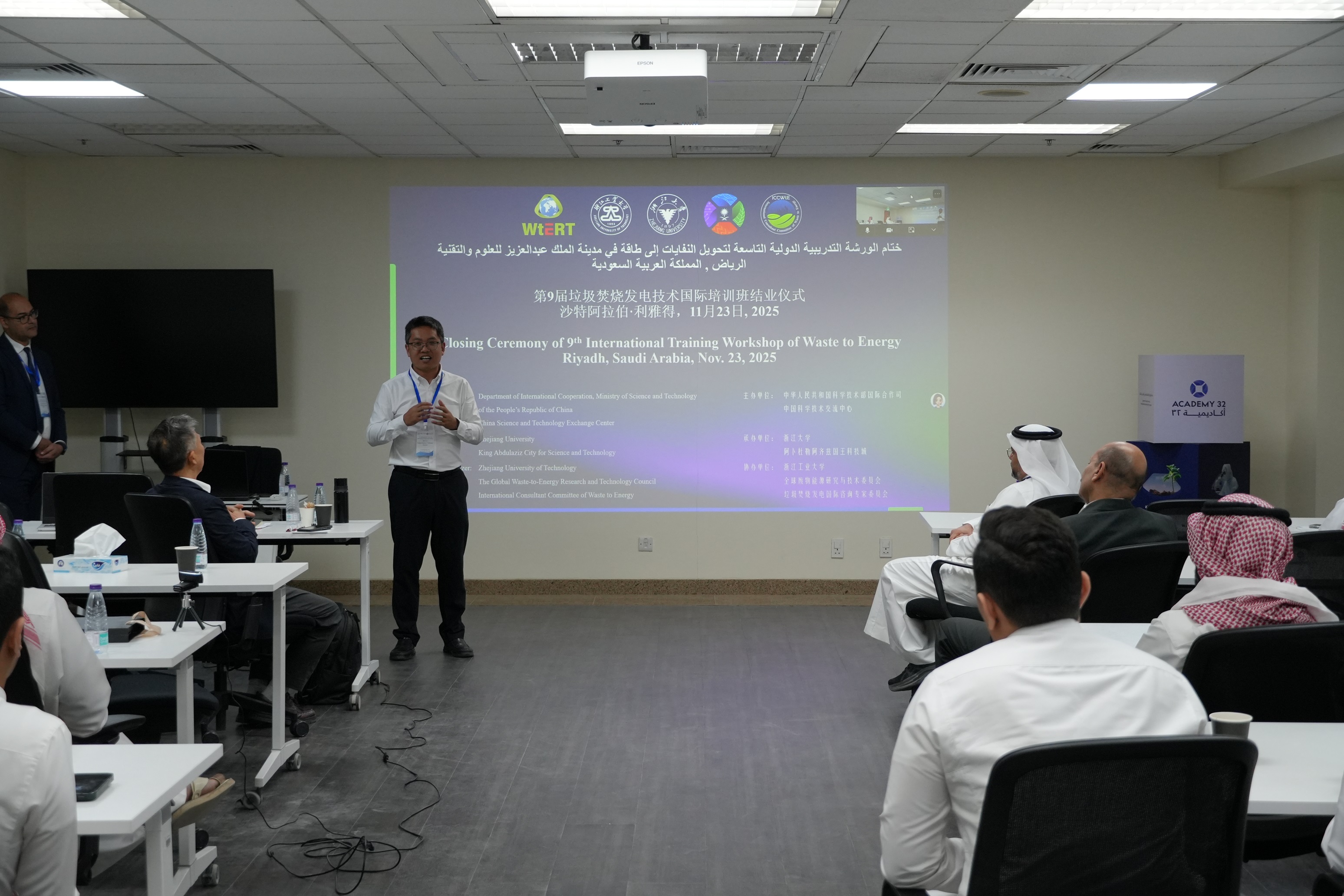 On November 23, 2025, the 9th International Training Workshop on Waste to Energy concluded with great success in Riyadh, Saudi Arabia. Jointly organized by Zhejiang University (ZJU) and Zhejiang University of Technology (ZJUT), the event was supported by the International Consultant Committee of Waste to Energy (ICCWtE), the King Abdulaziz City for Science and Technology (KACST), and the Global Waste-to-Energy Research and Technology Council (WtERT). The closing ceremony, chaired by Prof. Mi Yan of ZJUT, celebrated the achievements and insights shared throughout the event.